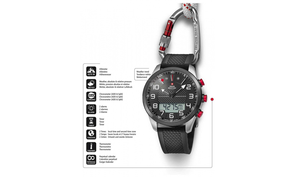 | Funkcionality | 2 timezones, Budík, Chronograph, Date, Perpetual calendar, Altimeter, Minúta, Second, Hour, Thermometer, Timer, Weather |